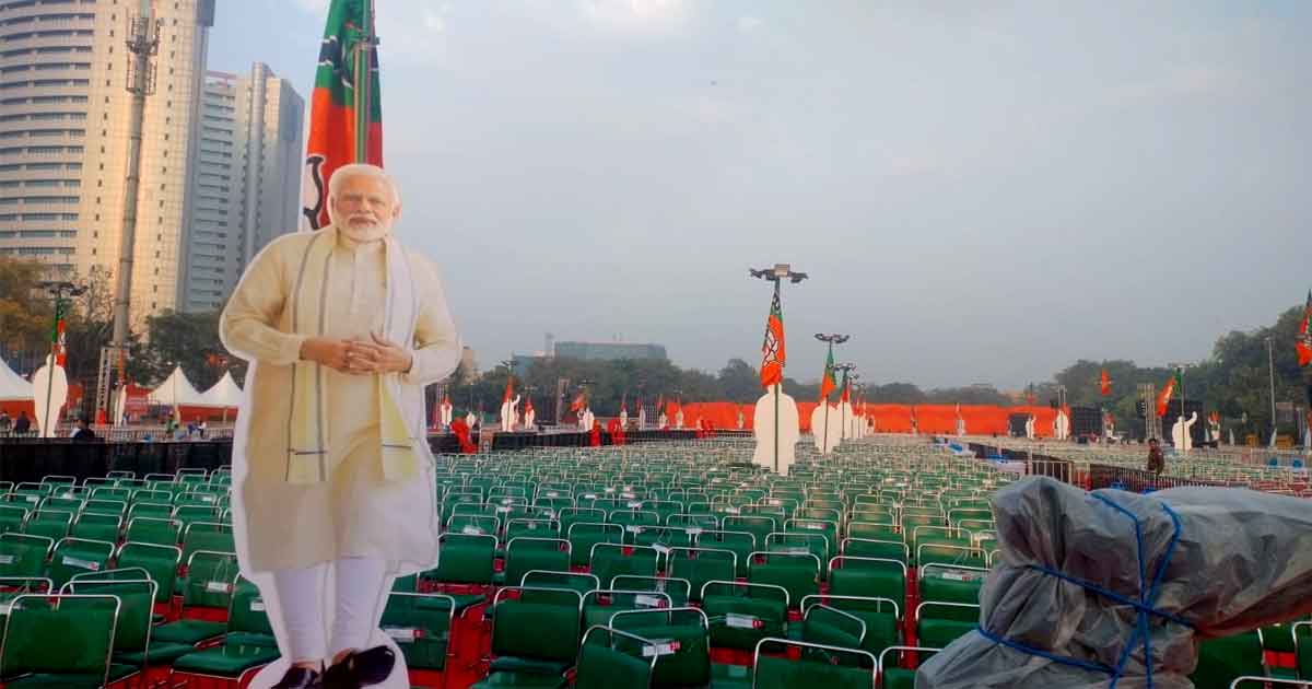 অনুষ্ঠানস্থলে প্রধানমন্ত্রী মোদীর বড় বড় কাটআউট লাগানো হয়েছে