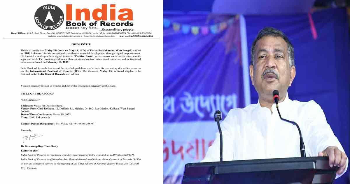 সমাজে ইতিবাচক পরিবর্তন আনার জন্য এক অদম্য উদ্যোগ, যা শুধুমাত্র কথা নয়, বরং কাজের মাধ্যমে সমাজের সকল স্তরে ইতিবাচক চিন্তাভাবনা ছড়িয়ে দেওয়ার প্রত্যয় নিয়ে শুরু হয়েছিল, তা আজ এক নতুন মাইলফলকে পৌঁছেছে। এই উদ্যোগটি হল ‘পজিটিভ বার্তা’, যার প্রতিষ্ঠাতা উদ্যোগপতি মালয় পিট, এবার ইন্ডিয়া বুক অফ রেকর্ডস (India Book of Records) থেকে মর্যাদাপূর্ণ “আইবিআর অ্যাচিভার” পুরস্কারে ভূষিত হচ্ছেন। এটি শুধু একটি পুরস্কার নয়, বরং সমাজে ইতিবাচকতার বার্তা ছড়ানোর জন্য তাঁর অবিচল প্রচেষ্টার স্বীকৃতি।